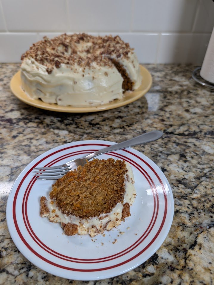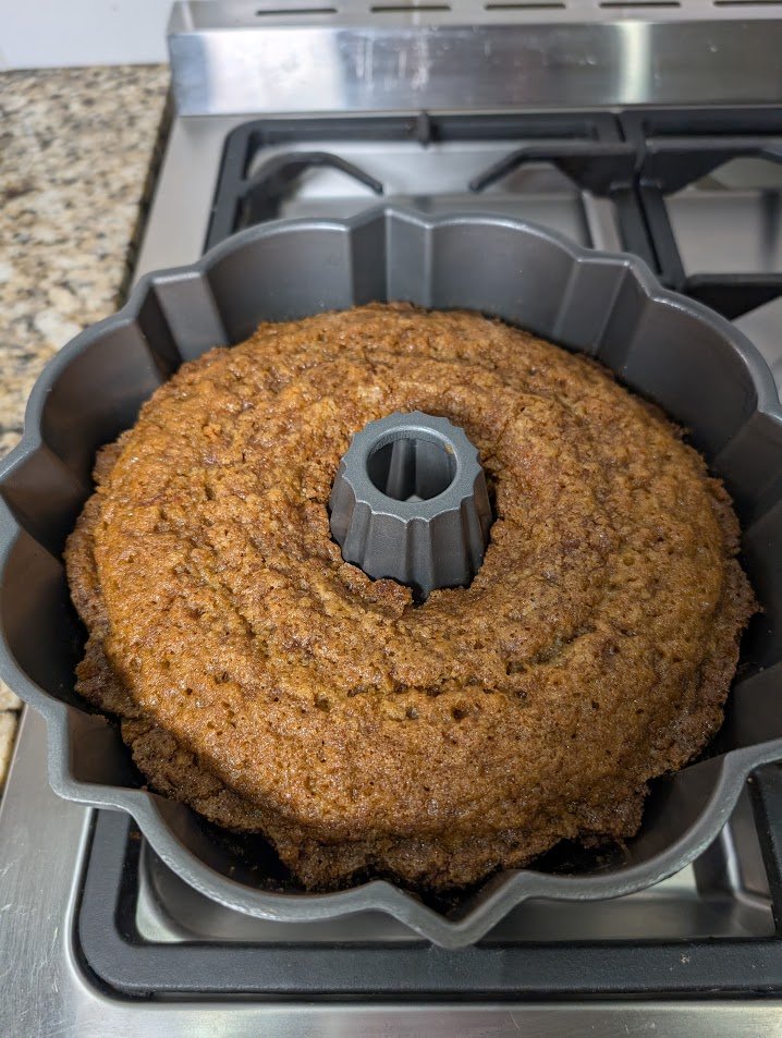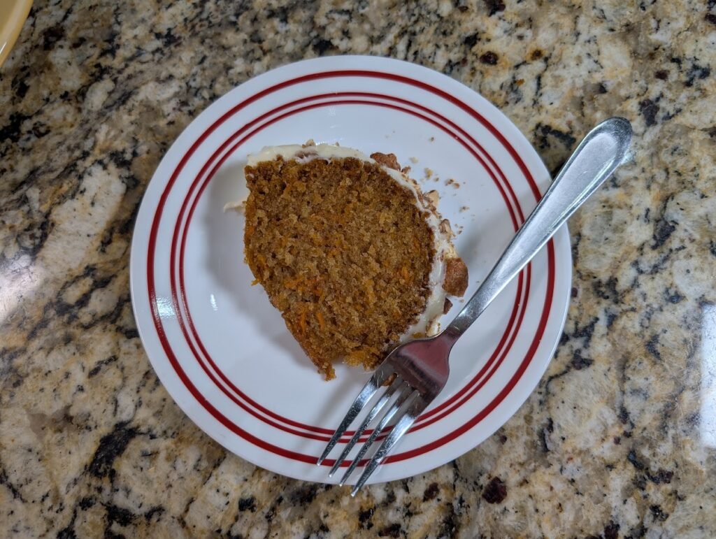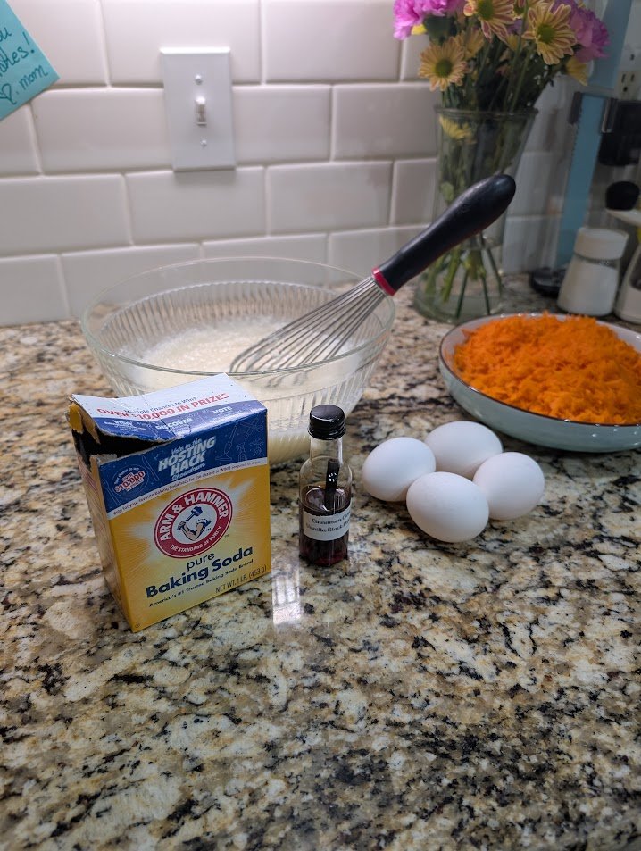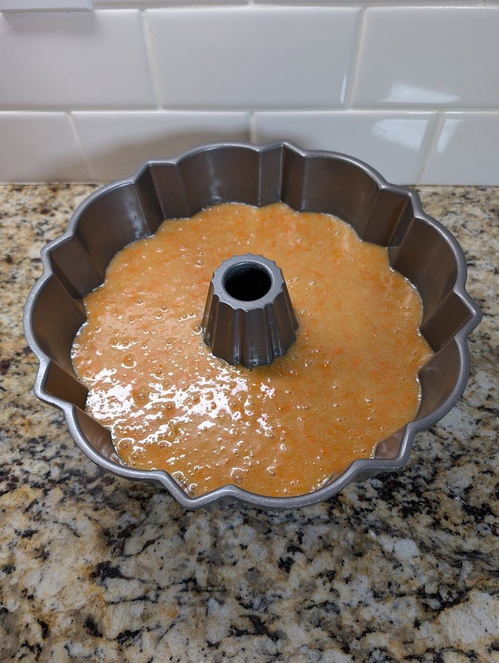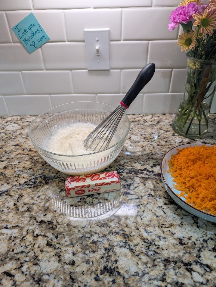 Preheat your oven to 325 degrees. In a medium bowl eggs, sugar, butter, oil and vanilla stir until blended then add the carrots. Next, add sugar and cinnamon and then mix well. Add one cup of flour and the baking soda to the bowl stir until combined then add the second cup of flour. The batter should look wet. Pour into a buttered bundt pan and bake at 325 degrees for 50 to 60 minutes. Allow cake to cool before removing from pan and frosting. Top the frosted cake with chopped pecans or walnuts(optional).